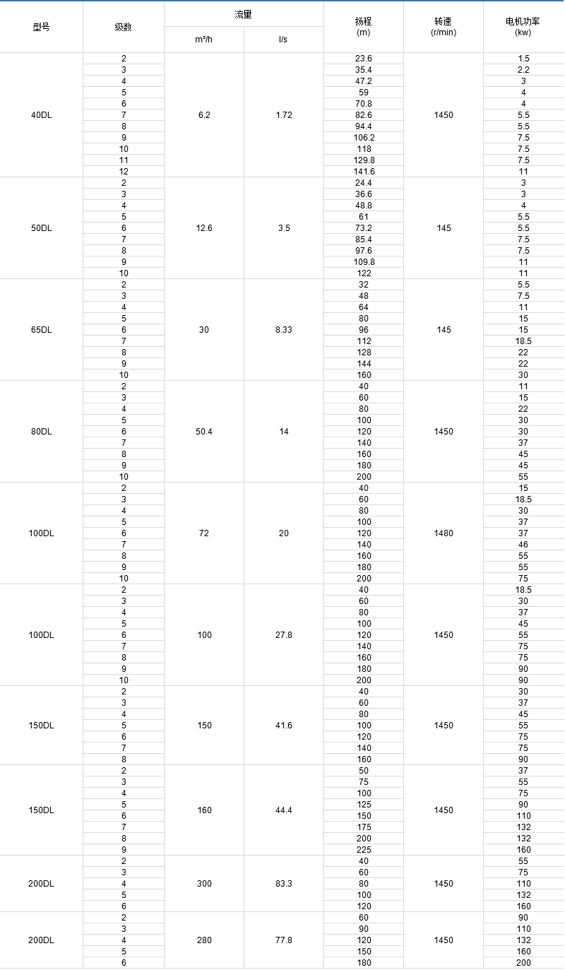 DL、DLR型泵系立式單吸多級分段式離心泵,供輸送不含固體顆粒的清水及物理化學性質(zhì)類似于水的液體之用。主要用于高層建筑供水,也可應用于廠礦給排水、輸送液體的流量范圍為6.2~280m3/h,揚程范圍為18.5~225m,配套功率范圍為1.5~200kw,口徑范圍為Ф40~Ф200mm。