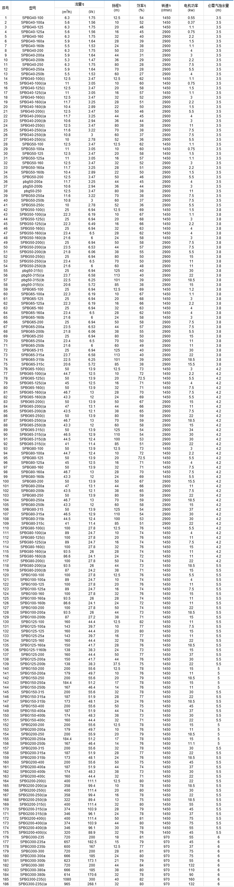 全系列共67個品種,184個規(guī)格,其性能范圍:流量6.3~1080m3/h,揚程12.5~125m,配用電機功率0.37~160kw,轉(zhuǎn)速1450r/min和2900r/min。